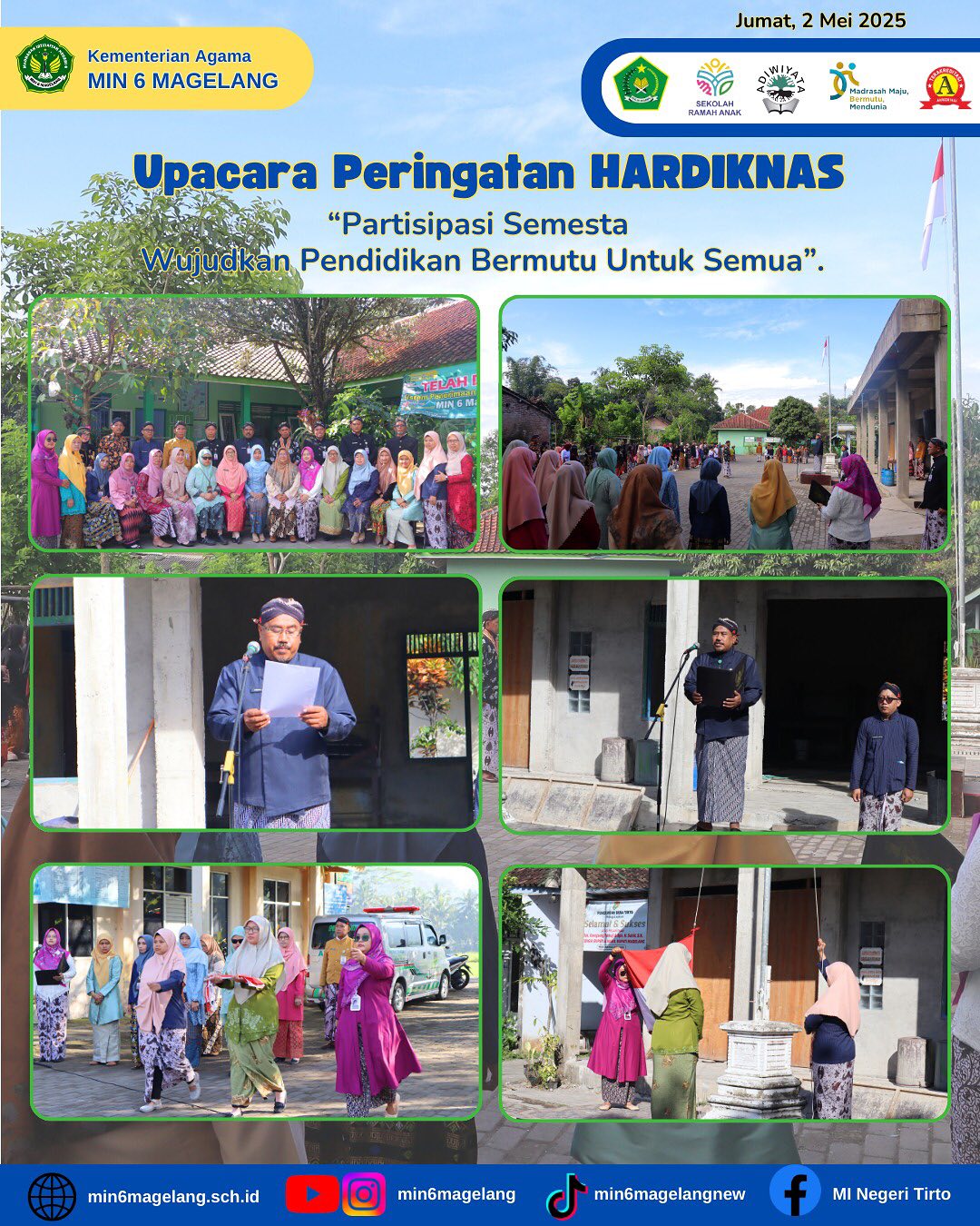 Mari kita jadikan peringatan Hari Pendidikan Nasional 2025 ini sebagai momentum untuk terus memperkuat tekad dalam memajukan madrasah dan dunia pendidikan Indonesia. Dengan semangat gotong royong dan kolaborasi, MIN 6 Magelang siap berkontribusi menciptakan pendidikan bermutu untuk semua.