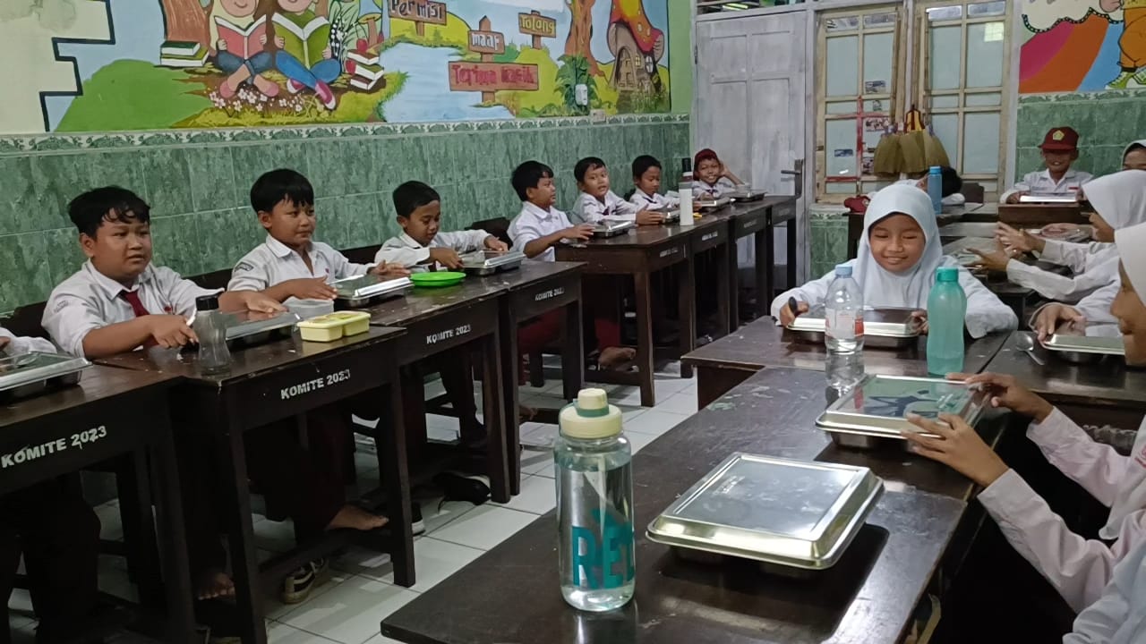 Siswa tampak senang dan antusias menerima makanan bergizi yang disediakan. Guru dan pendamping mengawasi agar kegiatan berlangsung tertib dan menyenangkan.